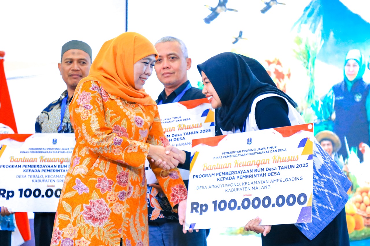 Pada kesempatan ini, Gubernur Khofifah secara langsung menyerahkan bantuan keuangan khusus dari Pemprov Jatim masing-masing sebesar Rp100 juta rupiah kepada 10 Desa penerima program.
